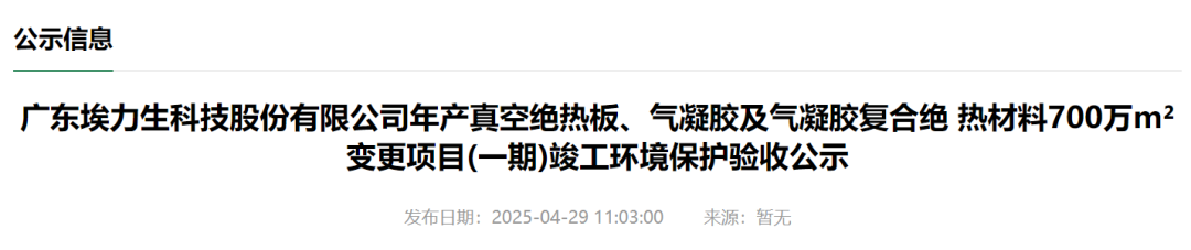 2025年4月29日,广东信科检测有限公司发布广东埃力生科技股份有限公司年产真空绝热板、气凝胶及气凝胶复合绝热材料700万m2变更项目(一期)竣工环境保护验收公示。【气凝胶相关资讯】关于召开第九届中国绝热节能材料行业科技创新大会暨“第五届气凝胶材料国际学术研讨会”的预通知