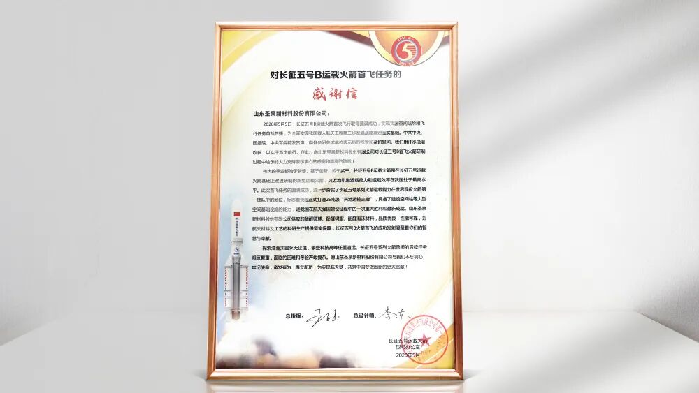 尤其值得一提的是,圣泉酚醛空心微球自神舟八号飞船开始,持续供应保障载人航天任务至今,成功助力长征五号-B运载火箭首飞,并连续用于探月工程等航空航天领域。