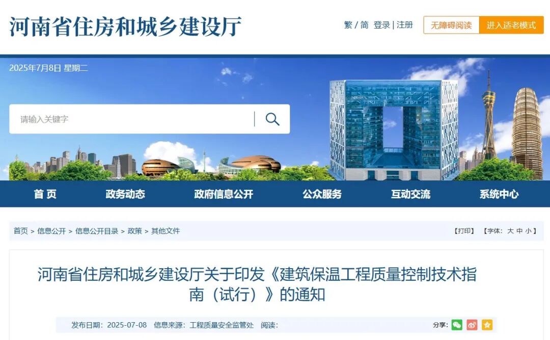 2025年6月30日,河南省住建厅印发《建筑保温工程质量控制技术指南(试行)》,其中涉及岩棉板/条、泡沫玻璃保温板、膨胀珍珠岩板等性能要求。