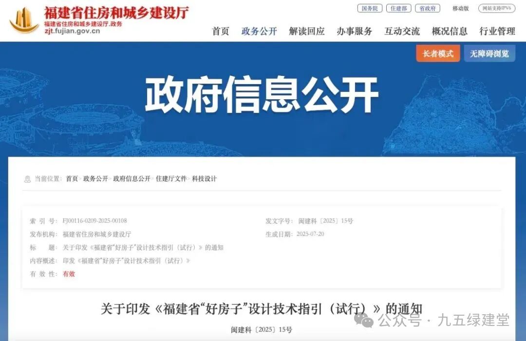 2025年7月20日,福建省住房和城乡建设厅印发《福建省“好房子”设计技术指引(试行)》。