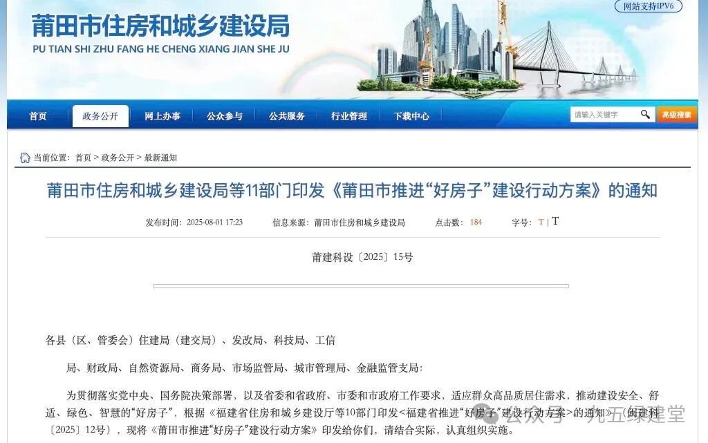 2025年7月21日,莆田市住房和城乡建设局等11部门印发《莆田市推进“好房子”建设行动方案》。