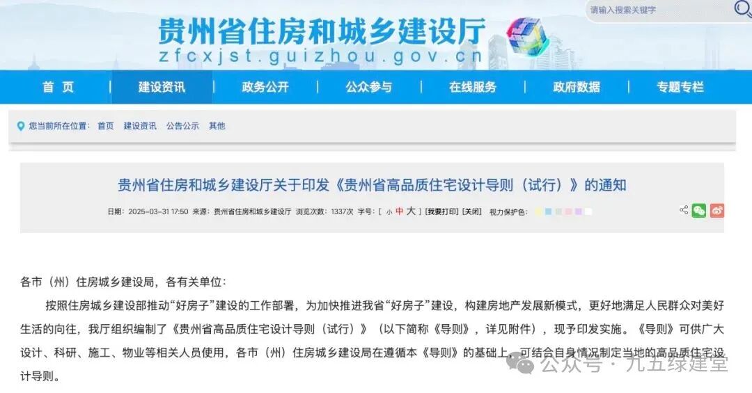 2025年3月25日,贵州省住房和城乡建设厅印发《贵州省高品质住宅设计导则(试行)》。