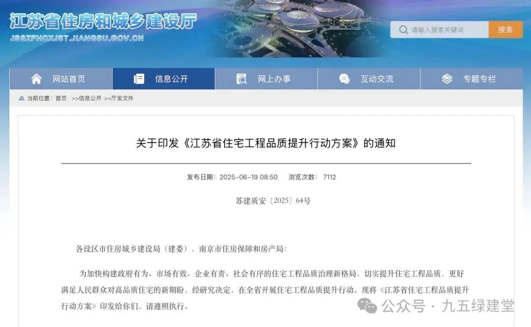 2025年6月18日,江苏省住房和城乡建设厅印发《江苏省住宅工程品质提升行动方案》。