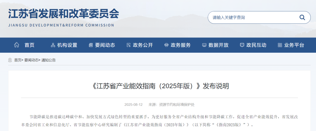 2025年8月12日,江苏省发改委印发《江苏省产业能效指南(2025年版)》(以下简称“《指南2025版》”)。《指南2025版》结合江苏省产业发展实际和特色,汇集了省重点领域产品能效、其他领域产品能效、设备能效、常用能源折标准煤系数参照表、能源计量器具配备率要求等内容,可为各级政府部门招引高效优质产业项目、遏制高耗能高排放项目盲目发展、淘汰落后和化解过剩产能等提供参考依据,为企事业单位加强行业能效对标、规范用能设备选型、提升节能降碳管理水平等提供重要指导,从而推动全省产业能效水平实现系统性提升。