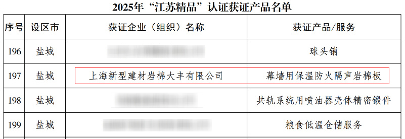 近日,2025年“江苏精品”认证名单正式公布,上海新型建材岩棉大丰有限公司(下文简称“ABM”)生产的“幕墙用保温防火隔声岩棉板”凭借优异的性能和可靠的品质成功通过认证,是ABM绿色工厂驻地——盐城大丰区的4家获证企业之一。