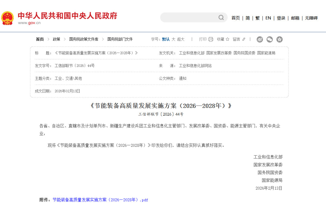 关于印发《节能装备高质量发展实施方案(2026—2028年)》的通知
