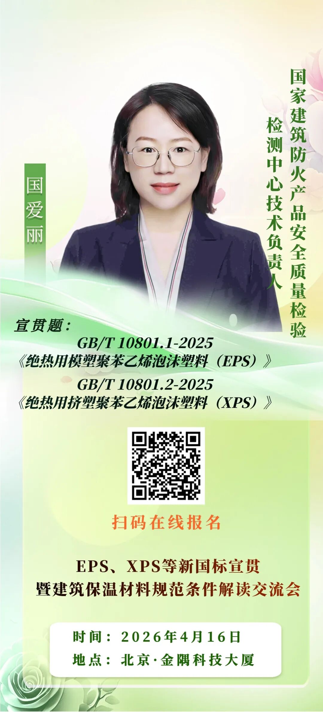 2026 年 4 月 16 日,由中国绝热节能材料协会与国家建筑防火产品安全质量检验检测中心联合主办,北京建筑材料检验研究院股份有限公司承办的EPS、XPS 等新国标宣贯暨建筑保温材料规范条件解读交流会将在北京金隅科技大厦重磅开启。