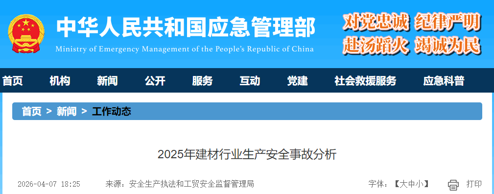 2026年4月7日,应急管理部安全生产执法和工贸安全监督管理局发布《2025年建材行业生产安全事故分析》。