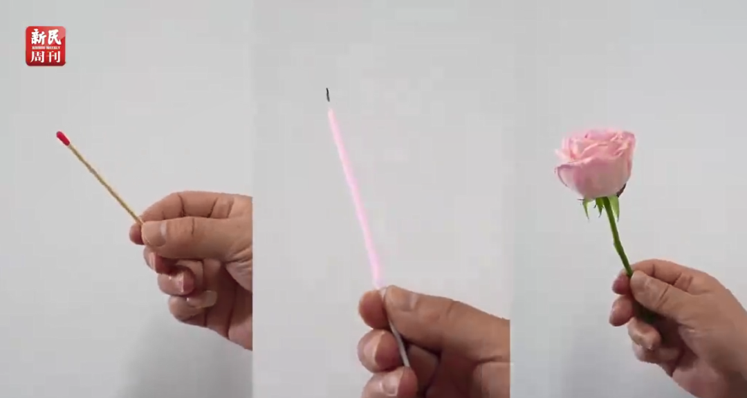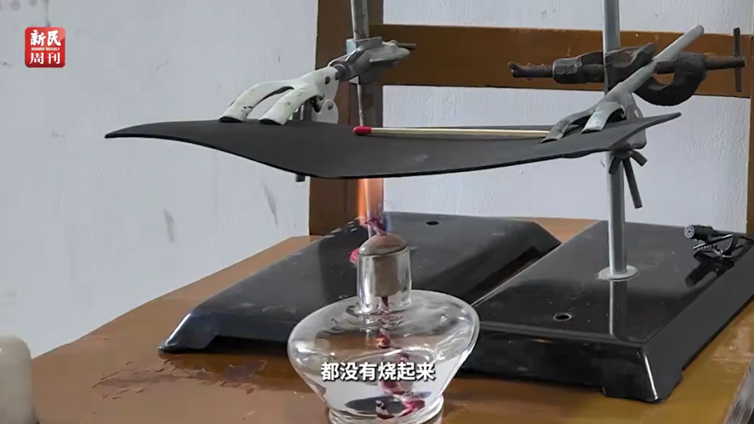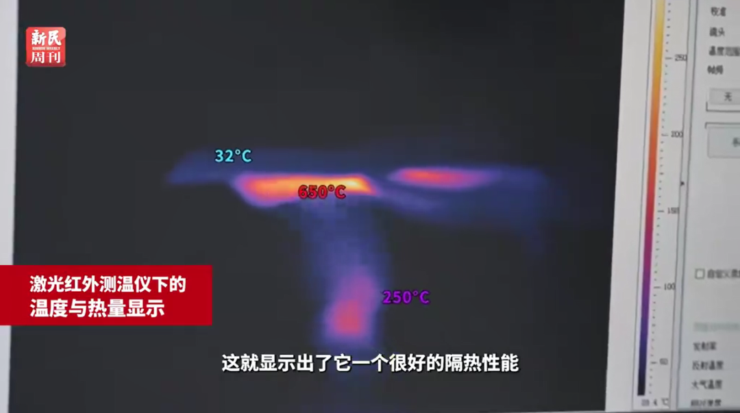 沈军教授分别将火柴、蜡烛和鲜花放置在一块电动汽车电池用气凝胶隔热材料上方,用酒精灯进行炙烤,通过激光红外测温仪观察温度变化。结果表明,用厚度仅有几毫米的气凝胶材料隔开后,火柴未被高温引燃,气凝胶被火焰灼烧的那一面温度约为650℃,而另一面的温度仅为32℃,用手抚摸感觉不到热。同样用蜡烛进行测试,蜡烛也没有出现软化和熔化的现象,用鲜花进行测试,用酒精灯炙烤后,在气凝胶材料阻隔下,鲜花几乎没有什么变化,未被烤黄枯萎。气凝胶材料表现出良好的隔热性能和防火阻燃性能。